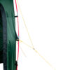 Палаткадостаточноустойчива, так как на внешнем тенте расположено четыре двухточечные оттяжки с системой динамической стабилизации. Оттяжкаодним концом крепится в верхней точке на тенте палатки, далее продевается через стальное кольцо и другим концом закрепляется ниже по тенту палатки. От кольца идет одиночная стропа оттяжки, которая крепится у земли. Петля может перемещаться в кольце, и вся конструкция имеет некоторую степень свободы, что позволяет палатке при порыве ветра немного качаться, сохраняя общую устойчивость и не вырывая колышки из земли. Оттяжки, регулируемые по длине, яркого цвета, чтобы их было видно даже ночью. Также необходимо закрепить палатку колышками по периметру, используя петли на палатке.